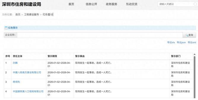 有限公司及其相关人员近日被深圳住房和建设局处以红色警示3个月,警示时间段为2026年1月2日至2026年4月1日。警示事由为现场发生一起事故,造