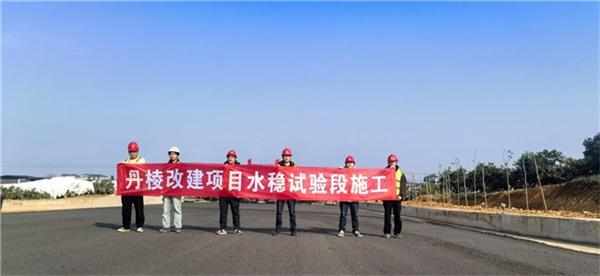 中交路建眉山丹棱改建项目完成水稳基层试验段摊铺